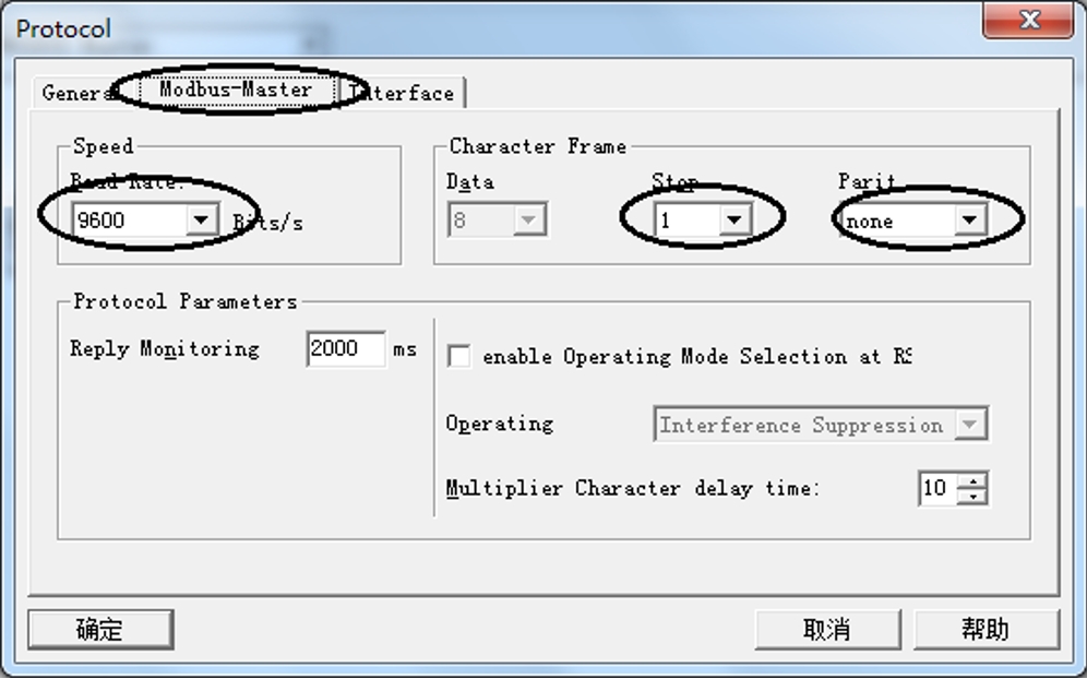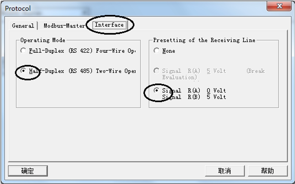 6、點(diǎn)擊“Interface”按鈕,進(jìn)入RS485通訊模式畫面。點(diǎn)擊確定,返回參數(shù)設(shè)置對(duì)話框,點(diǎn)擊“保存”保存所修改參數(shù)。如上圖點(diǎn)選:半雙工、A-/B。