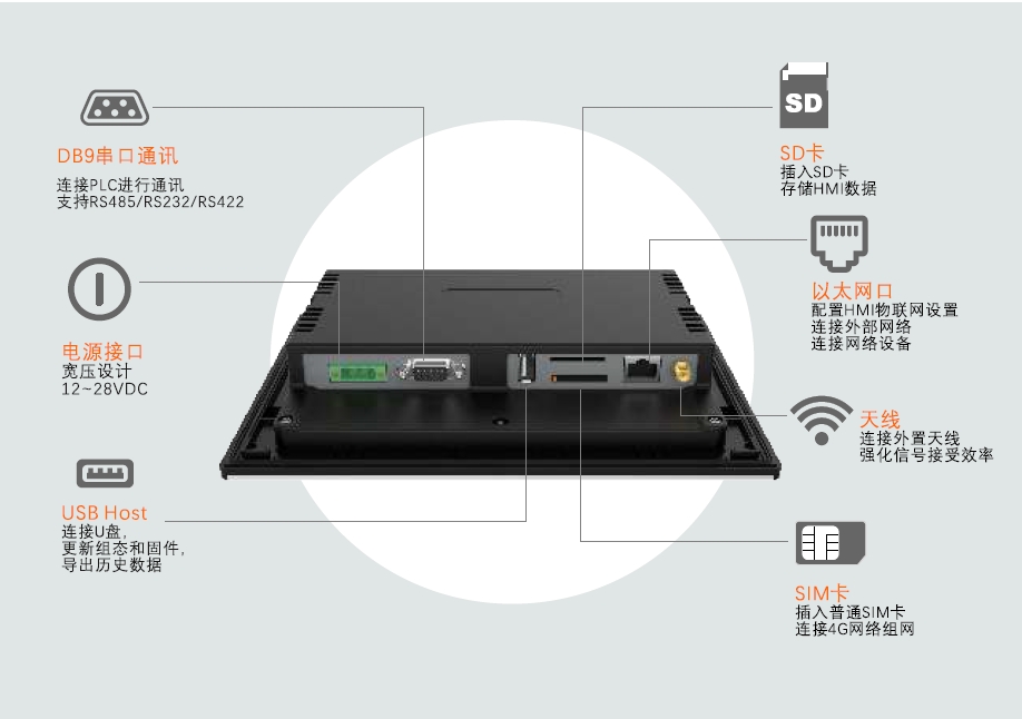| USB Host | USB2.0 x 1, Type A(USB1),支持U盤更新固件、組態(tài)和存儲數(shù)據(jù) | ||